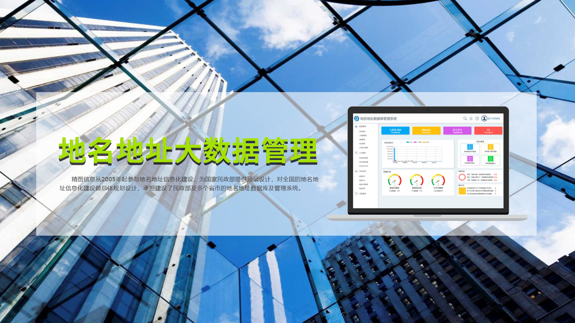 創(chuàng)立于1999年,是北京飛利信科技股份有限公司(股票代碼:300287)子公司,是國家創(chuàng)新型企業(yè)、國家火炬計(jì)劃重點(diǎn)高新技術(shù)企業(yè);獲批建有福建省博士后創(chuàng)新實(shí)踐基地、福建省院士專家工作站、廈門市院士專家工作站。精圖信息承擔(dān)了國家發(fā)改委、國家工信部、國家科技部、國家住建部、國家民政部等重大和重要專項(xiàng)50多項(xiàng),主導(dǎo)和參與制定國家和行業(yè)標(biāo)準(zhǔn)、規(guī)程、導(dǎo)則60多項(xiàng),擁有自主知識(shí)產(chǎn)權(quán)的專利和軟件著作權(quán)500多項(xiàng)。